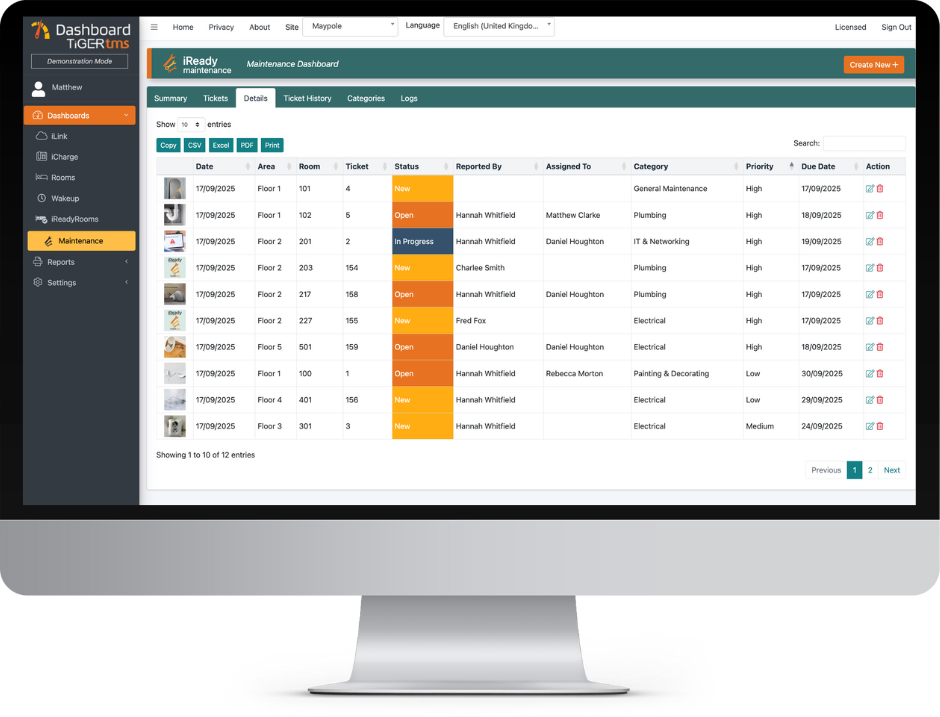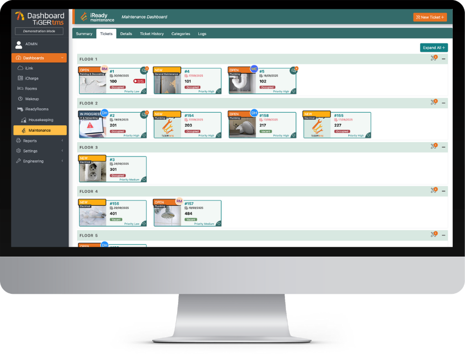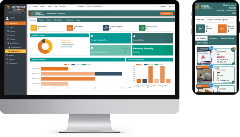 Seamless usability with the same iReadyRooms Dashboard accessing both Housekeeping and Maintenance tasks